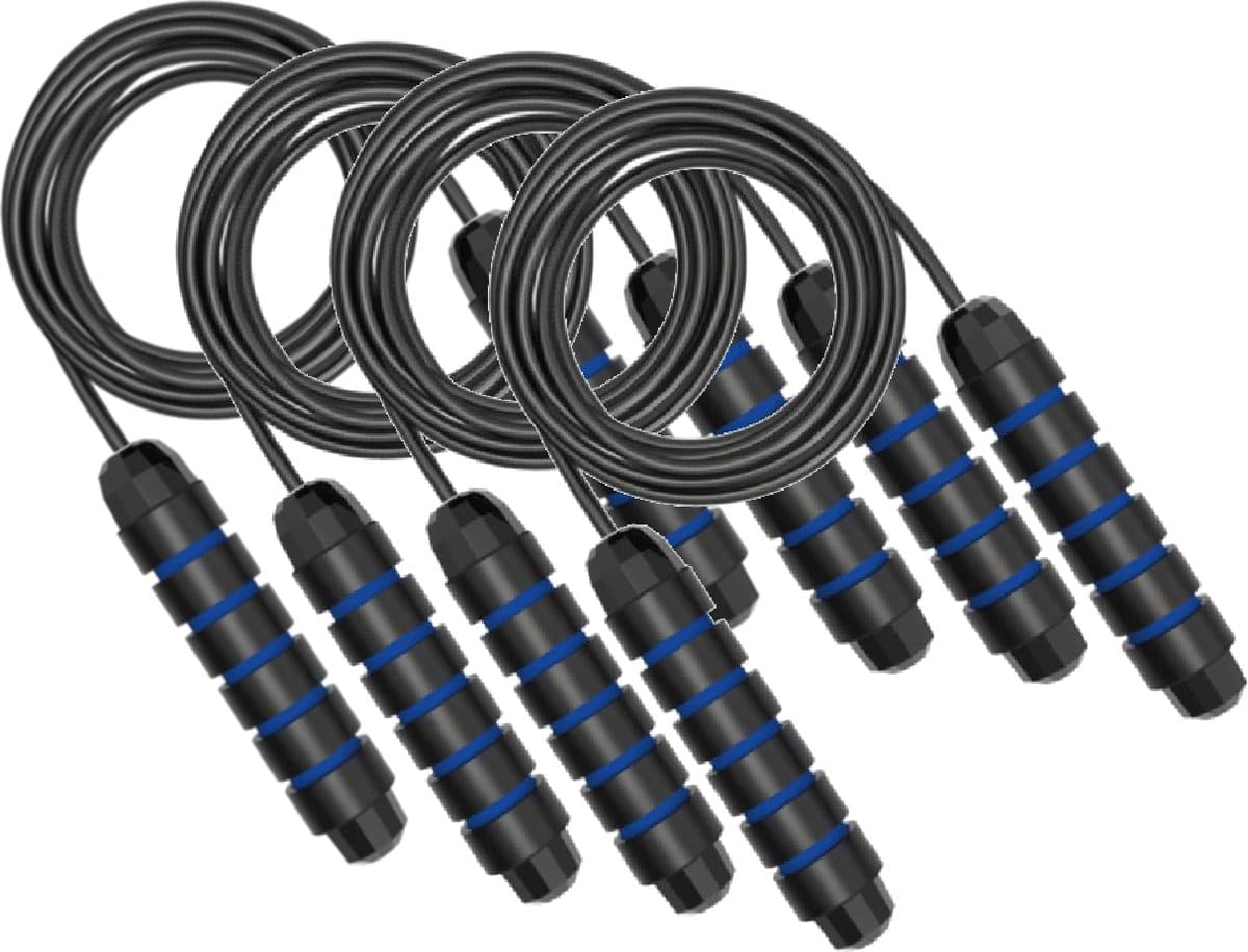 4 x WM Sports Springtouw verzwaard – Touwtje springen – Rope skipping – Jump rope – Speedrope – Verstelbaar – Voor volwassenen en kinderen – Sport springtouw – Fitness, crossfit en boksen – Staaldraad – Foam handvaten – Lengte 280 cm – Zwart en blauw