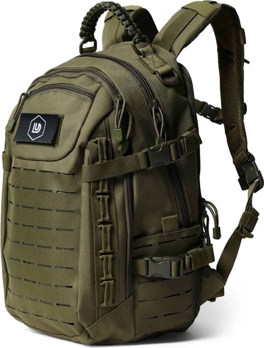 Het MOLLE bevestigingssysteem Misschien ben je er al bekend mee, maar onze tas is voorzien van een laser gesneden MOLLE systeem. Dit systeem wordt al jaren gebruikt door onder andere defensie om snel en stevig iets te bevestigen. Denk bijvoorbeeld aan opbergtasjes, zaklamp of een zakmes. Er zijn hier enorm veel mogelijkheden in. Dit maakt deze tas ook bijzonder geschikt om mee te nemen op outdoor activiteiten.