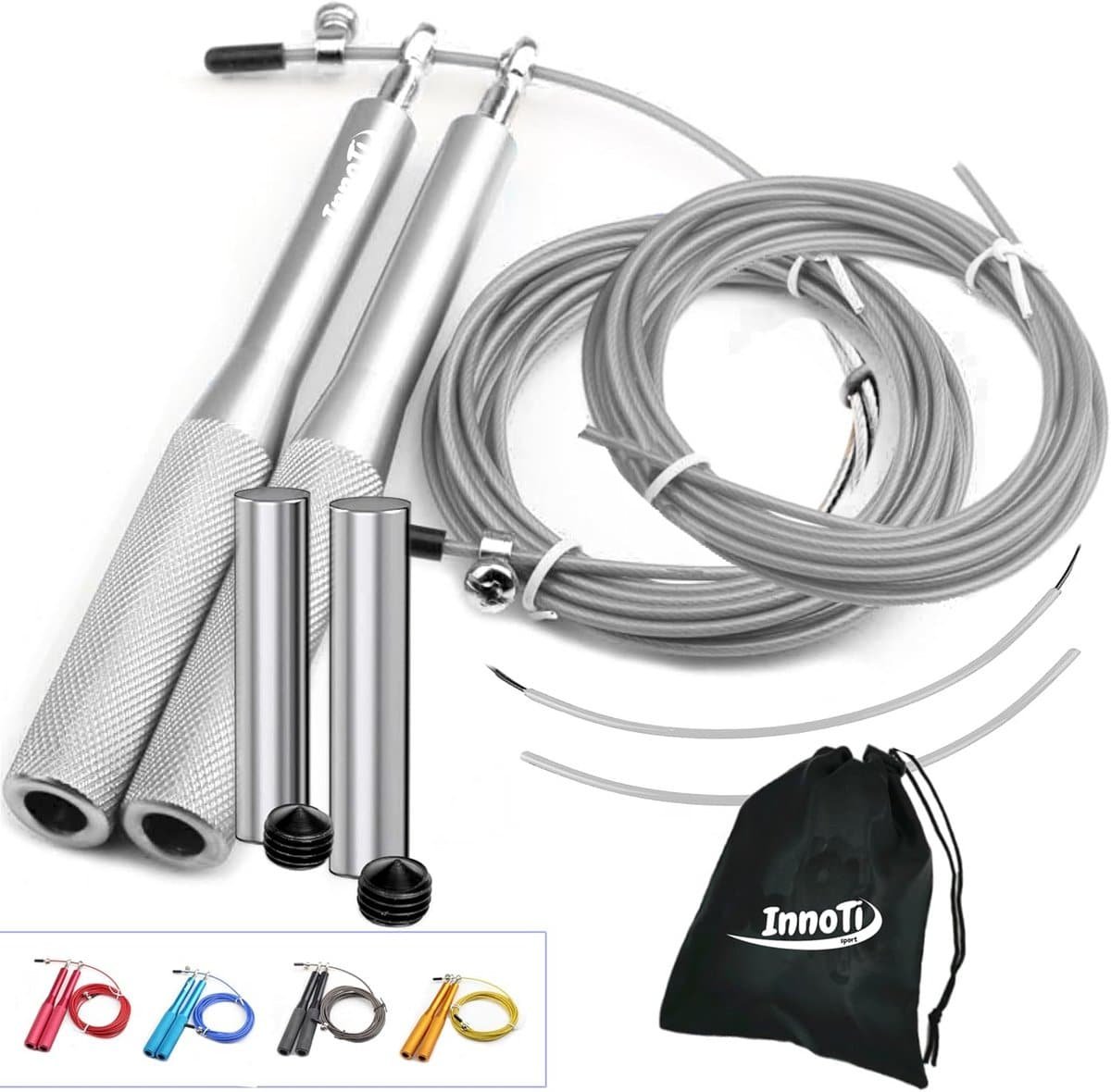 Verbeter je training en conditie met dit verstelbare speed springtouw. Gemaakt van lichtgewicht aluminium en voorzien van kogellagers voor hoge snelheden en dubbele sprongen. Ideaal voor Crossfit, boksen en algemene fitness. Het touw heeft een duurzame 2.5 mm staalkabel die eenvoudig aan te passen is aan de lichaamslengte tot meer dan 2 meter. Kies voor de optie met optionele gewichten (60grs per handvat) om je onderarmen te trainen, of verwijder deze voor puur snelheidswerk. De ergonomische, getextureerde aluminium handvatten zorgen voor een uitstekende grip. Het touw is robuust, lichtgewicht en wordt geleverd met een extra reservekabel, beschermende buisjes voor de kabel en een handige opbergtas om het mee te nemen. Je krijgt ook een verkoelende handdoek (30 x 90 cm) cadeau bij aankoop. Optimaliseer je training, verbrand calorieën en verbeter je coördinatie met dit veelzijdige en duurzame springtouw.