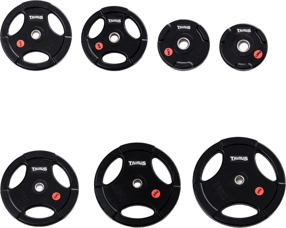 De schijven van 5 kg en groter zijn tevens voorzien van praktische handvatten. De Taurus 3G Pro halterschijven 30 mm gerubberd zijn verder perfect afgewerkt met een hoogwaardige rubber coating.