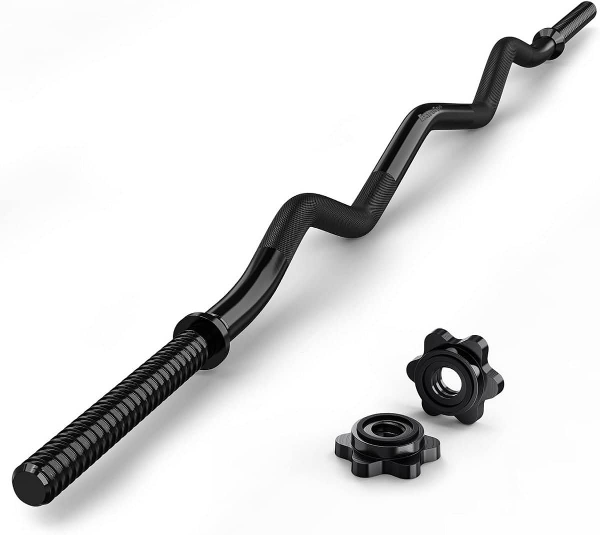 Veelzijdige 47 inch (120 cm) EZ Curl stang, ideaal voor effectieve krachttraining thuis of in de sportschool. Deze stang is perfect voor diverse oefeningen zoals hip thrusts, squats en lunges. Ontworpen om gebruikt te worden met 1 inch halterschijven. Wordt geleverd inclusief sterren haltersluitingen voor veilige training. Geschikt voor serieuze fitnessliefhebbers die hun biceps, triceps en schouders willen trainen.