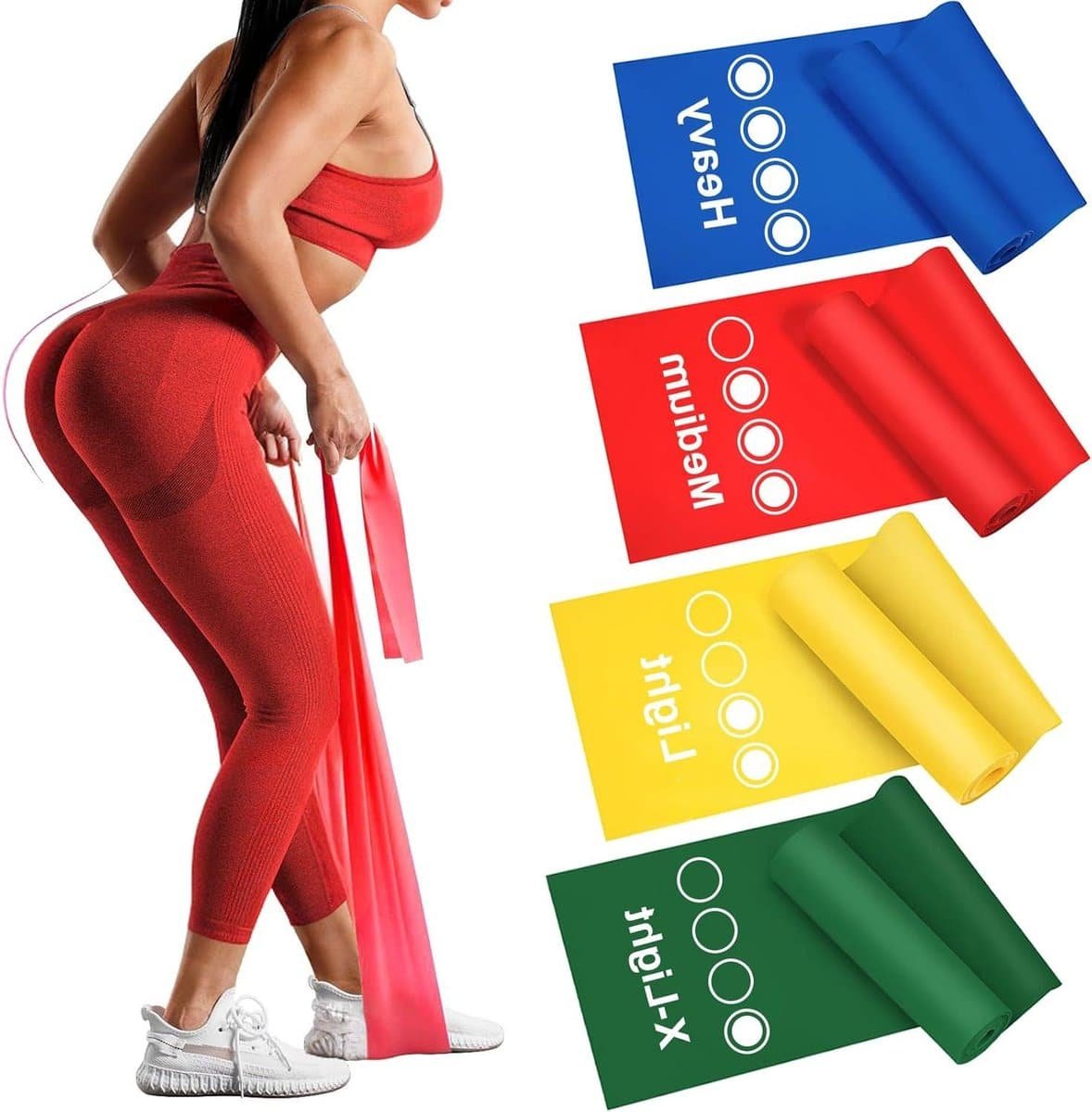 18 m elastische fitnessbanden set van 4 met 4 weerstandsniveaus – pilates krachttraining en spiertraining voor mannen en vrouwen