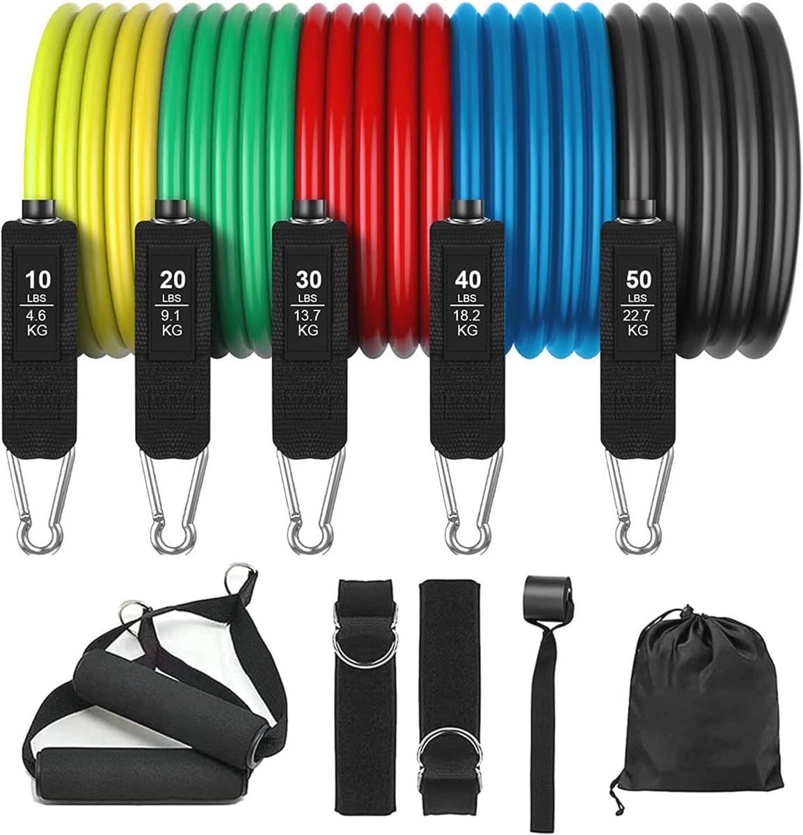 Pas je weerstandsniveau aan met deze set van 5 fitnessbanden ontworpen voor krachtige en efficiënte training. Elke band heeft een weerstandssterkte van 25 kg tot 150 lbs ideaal voor al je trainingsbehoeften. Train je hele lichaam: versterk je armen rug borst buikspieren en benen. De gebruiksvriendelijke banden zijn zowel afzonderlijk als gestapeld te gebruiken met een draagvermogen van 150 lbs. Inclusief handige handgrepen met comfortabele schuimlaag voor een stevige grip robuuste enkelriemen voor maximale veiligheid en een degelijke deuranker om thuis te trainen zonder schade. Versterk je training met deze complete set!
