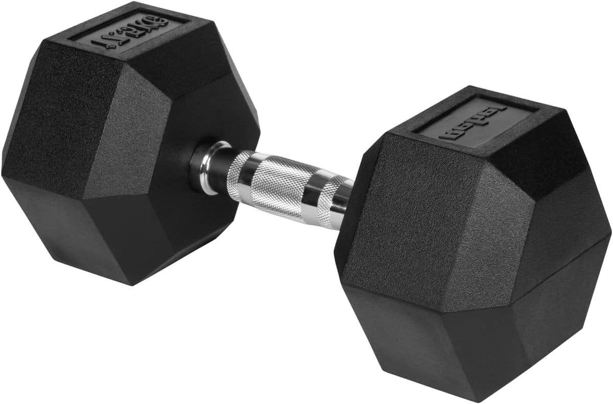 Versterk je spieren met deze hoogwaardige halter van 17,5 kg, ideaal voor je thuis- of sportschooltraining. Deze halter is ontworpen om je fitnessroutine naar een hoger niveau te tillen, of je nu begint met krachttraining of een ervaren sporter bent. De halter is vervaardigd uit stevig gietijzer en voorzien van een duurzame rubberen coating, wat zorgt voor een comfortabele grip en bescherming van je vloer. Dankzij het hexagonale ontwerp rolt de halter niet weg wanneer je hem neerlegt, wat extra veiligheid biedt tijdens je oefeningen. Gebruik hem voor een breed scala aan oefeningen, zoals bicep curls, shoulder presses en lunges, om verschillende spiergroepen effectief te trainen. Met een gewicht van 17,5 kg biedt deze halter een uitstekende uitdaging voor diverse trainingsniveaus. De ergonomische handgreep van 13 cm met een diameter van 3,4 cm zorgt voor een stabiele en veilige houvast. Investeer in je gezondheid en fitnessdoelen met deze betrouwbare en veelzijdige halter.