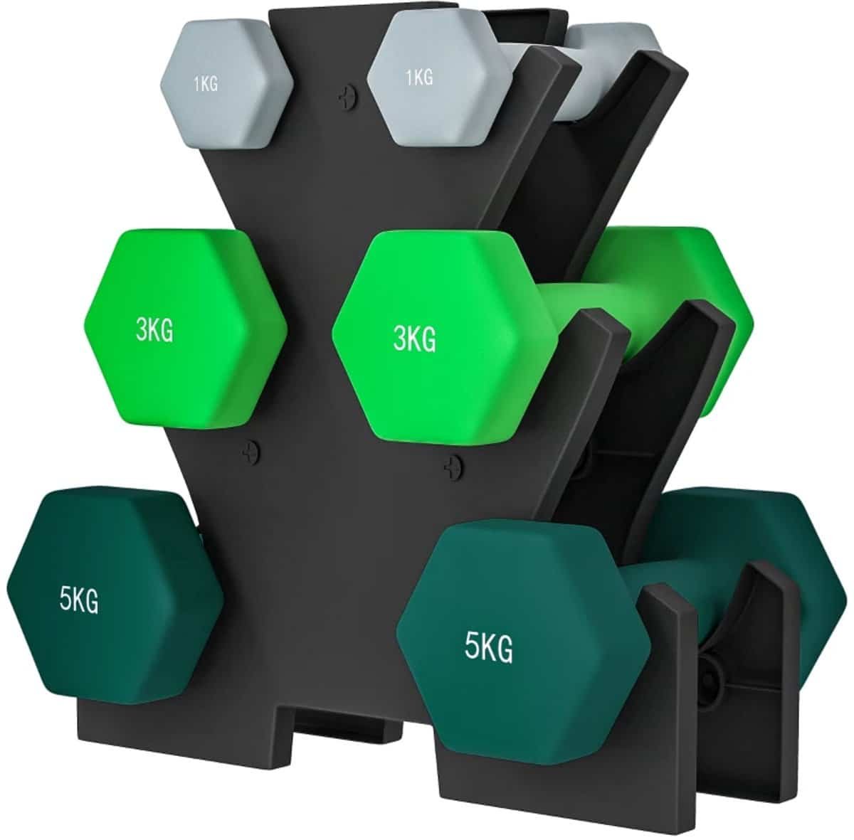 Halterset met Halterstandaard – Dumbells – Gewichten – Dumbells set van 6 Halters – Gewichten Fitness – 2 x 1 kg, 2 x 3 kg, 2 x 5 kg – Halter set voor Krachttraining, Workout, Gym