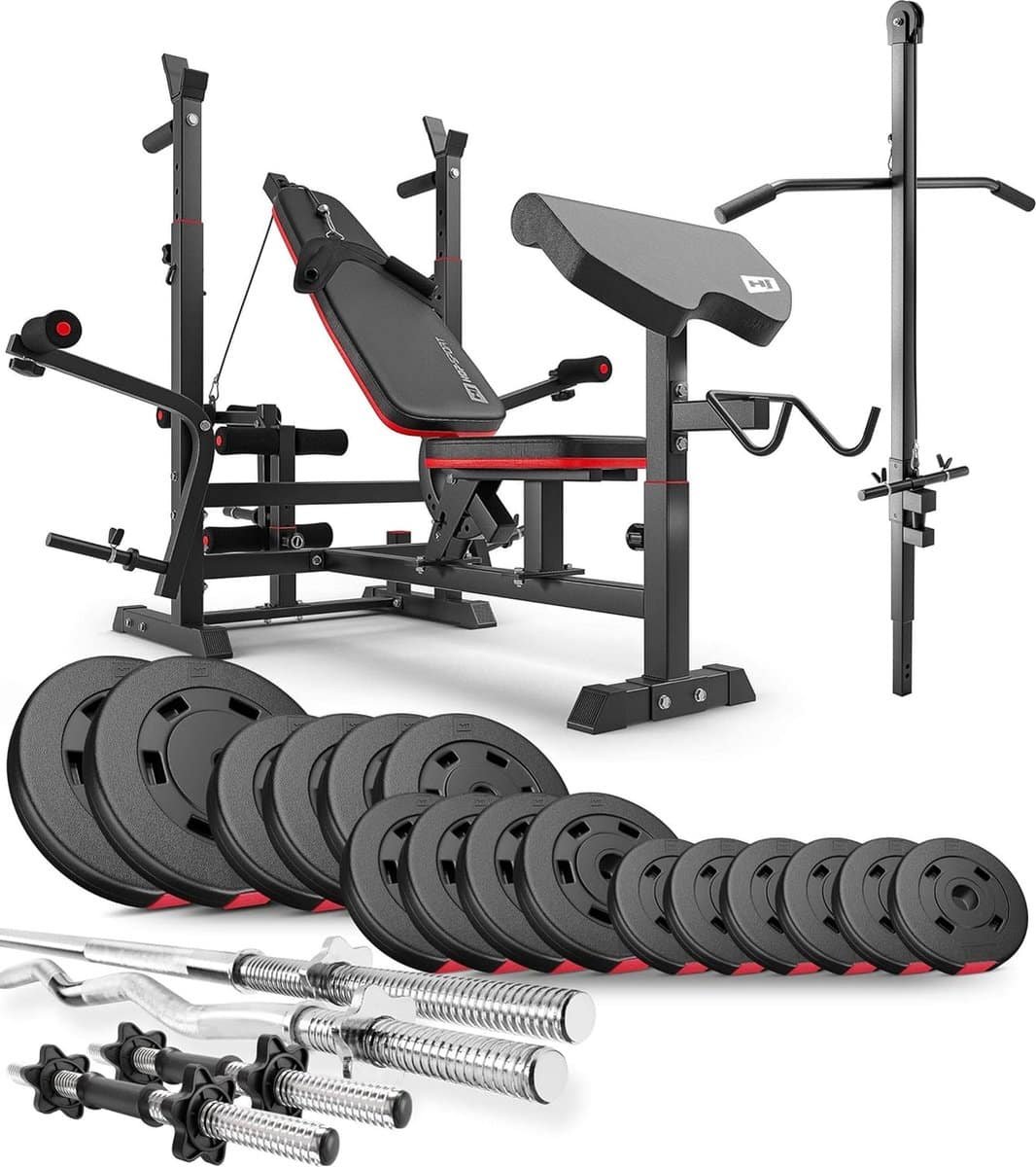 Hop-Sport Halterbank Krachtstation HS-1075 – Verstelbare Trainingsbank met Lange Halter, Curlstang, Korte Halters & 75 kg Gewichten voor Complete Krachttraining