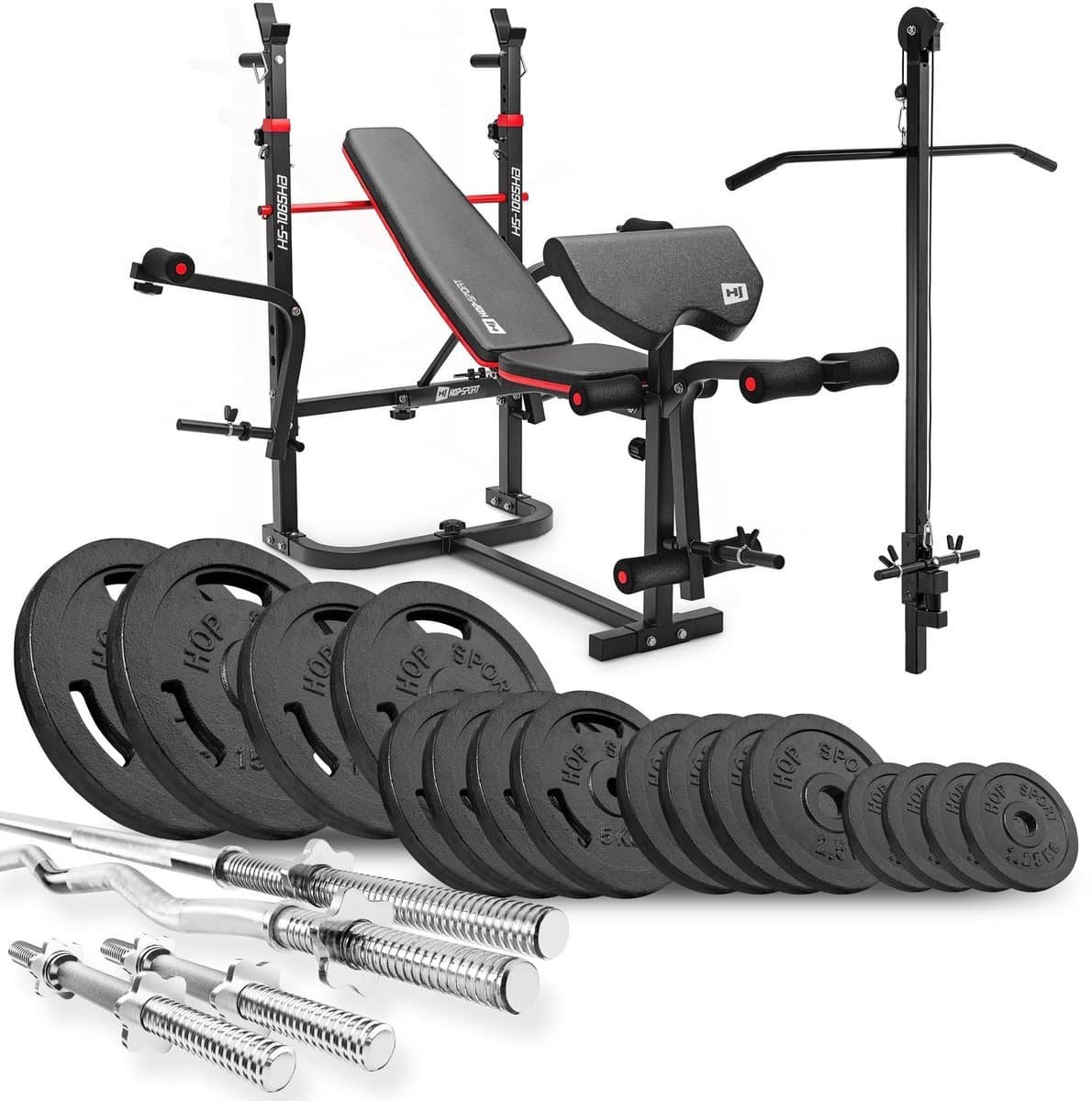 Hop-Sport HS-1065 – Halterbank Set – Gietijzeren Halterset met Lat Pulley – Verstelbaar – Krachttraining Thuis