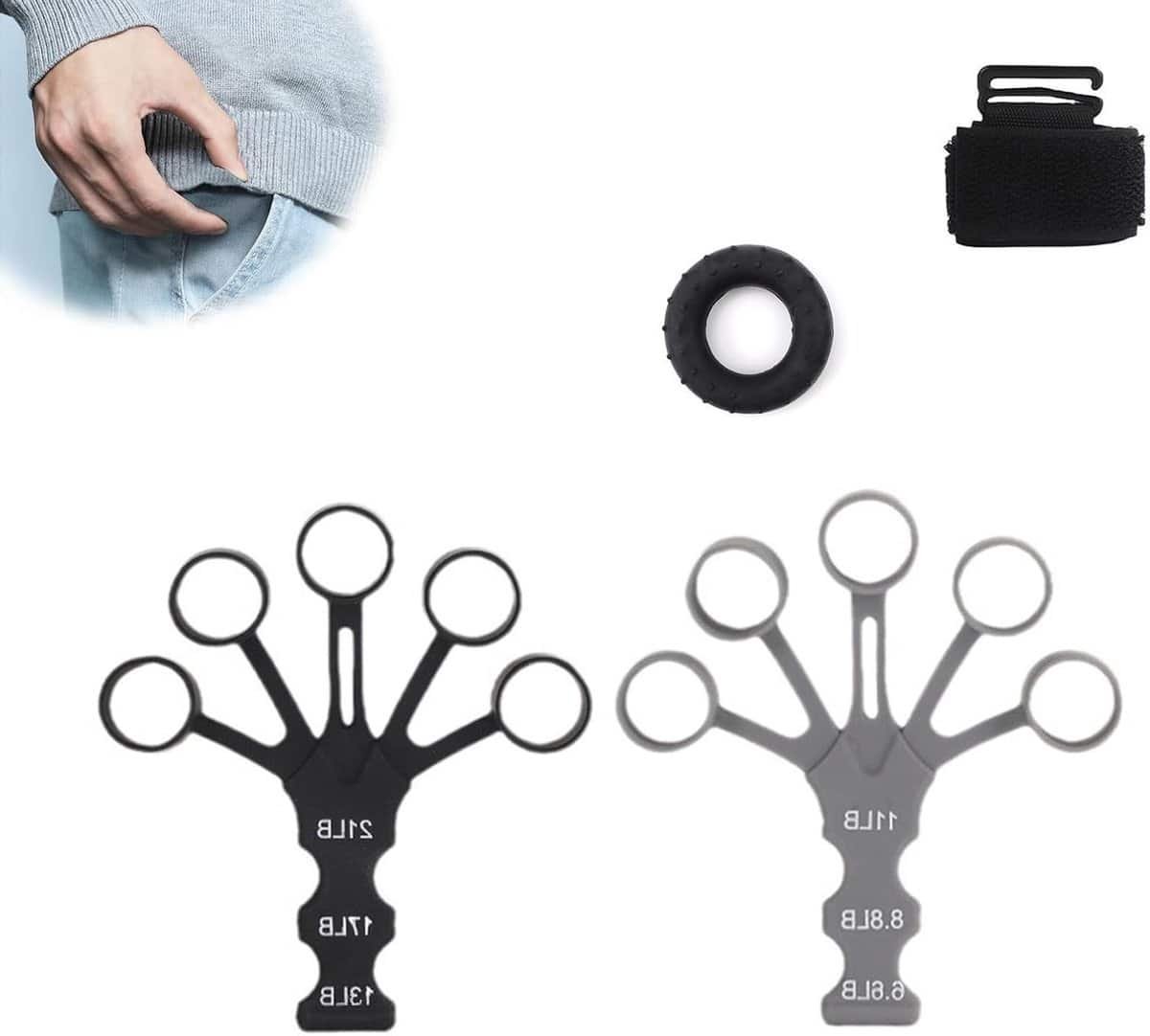JGS Premium – Grip Trainer 2 stuks zwart grijs siliconen – Onderarm trainingsapparaat – Hulpgreep voor handkracht – Polsspanner – Vingers krachttraining – Verbetering van de grip