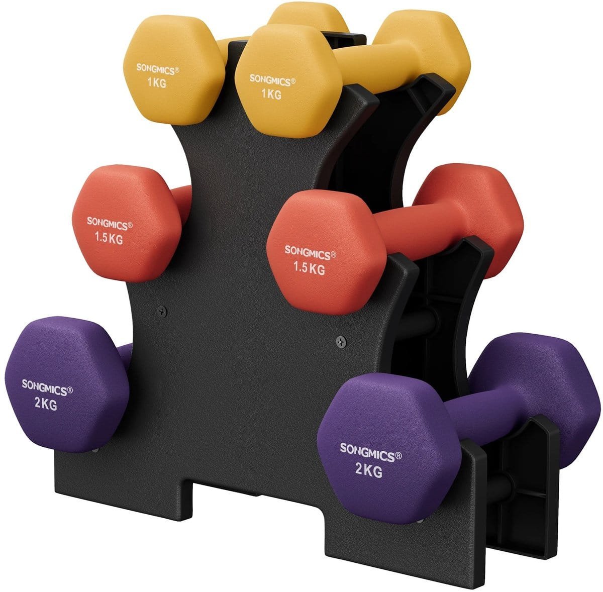 Norvia – Dumbbell Set met Standaard – Yoga Dumbbells – Krachttraining – Geel – Oranje – Paars – Antislip – Neopreen Coating