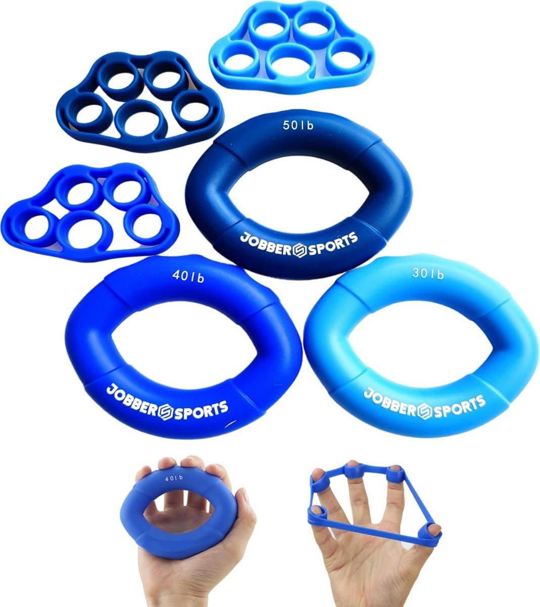 De 6-delige handtrainer training set van Jobber Sports is de ideale fitnessapparatuur om de grip in je handen en de sterkte in je voorarm, onderarm en vingers te verbeteren in drie verschillende gebieden: verpletteren, knijpen en extensie. De vinger stretcher & de siliconen grip ring is geschikt voor mannen & vrouwen, ouderen, jongeren en mensen die naar de fysiotherapie gaan of op weg zijn naar herstel na een operatie. Deze set bestaat uit 3 vinger stretchers en 3 siliconen grip ringen.
