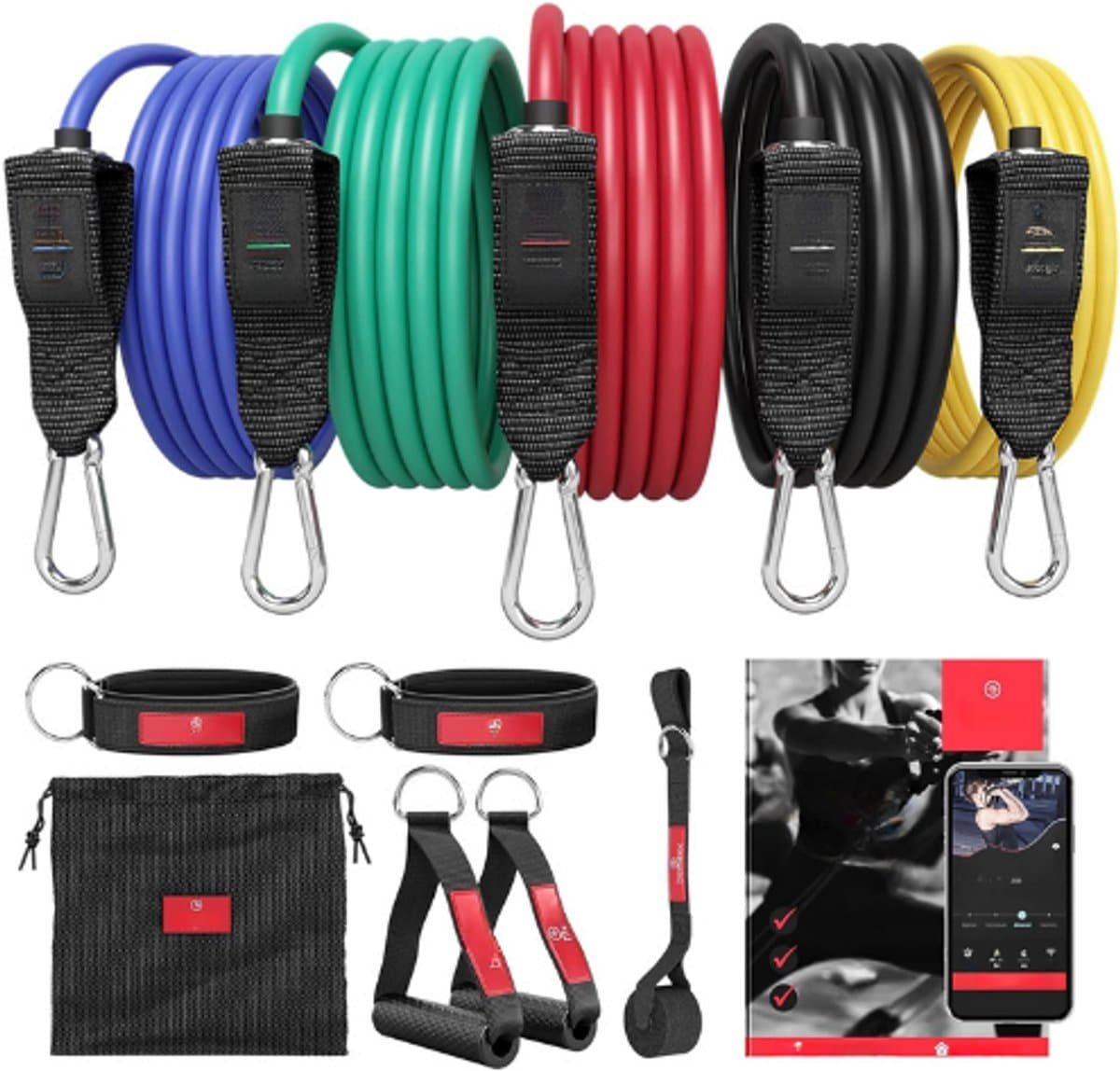 De 5 weerstandsbanden met verschillende weerstandsniveaus (tot 100 lbs/45 kg gecombineerd) kunnen los of samen worden gebruikt. Dankzij de handvaten, enkelbanden en het deuranker kun je full-body oefeningen uitvoeren, waar je ook bent. De meegeleverde trainingsgids/eBook helpt je bovendien op weg met gerichte workouts.
