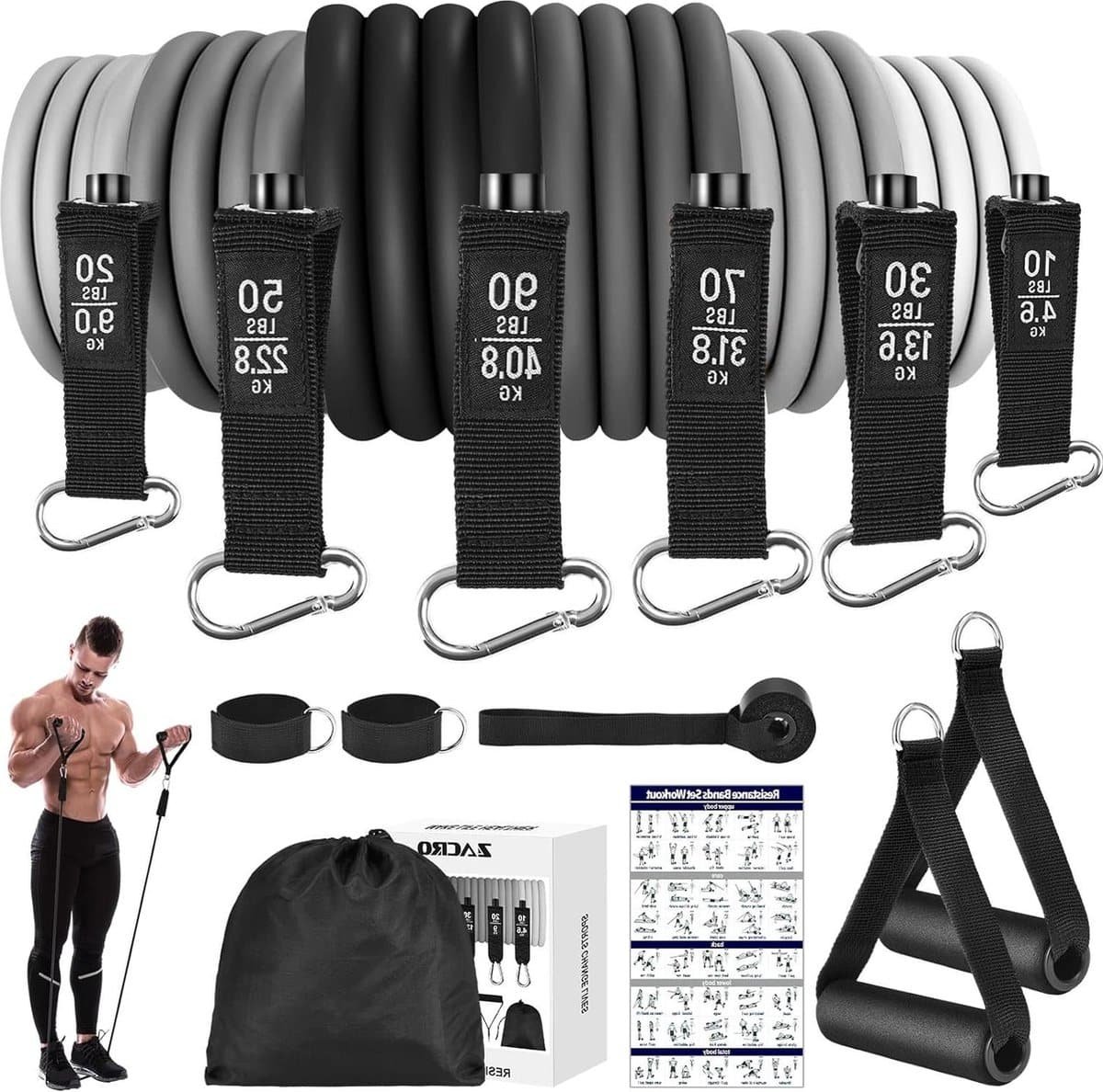 – 6 kleurgecodeerde weerstandsbanden (10 lbs, 20 lbs, 30 lbs, 50 lbs, 70 lbs, 90 lbs)