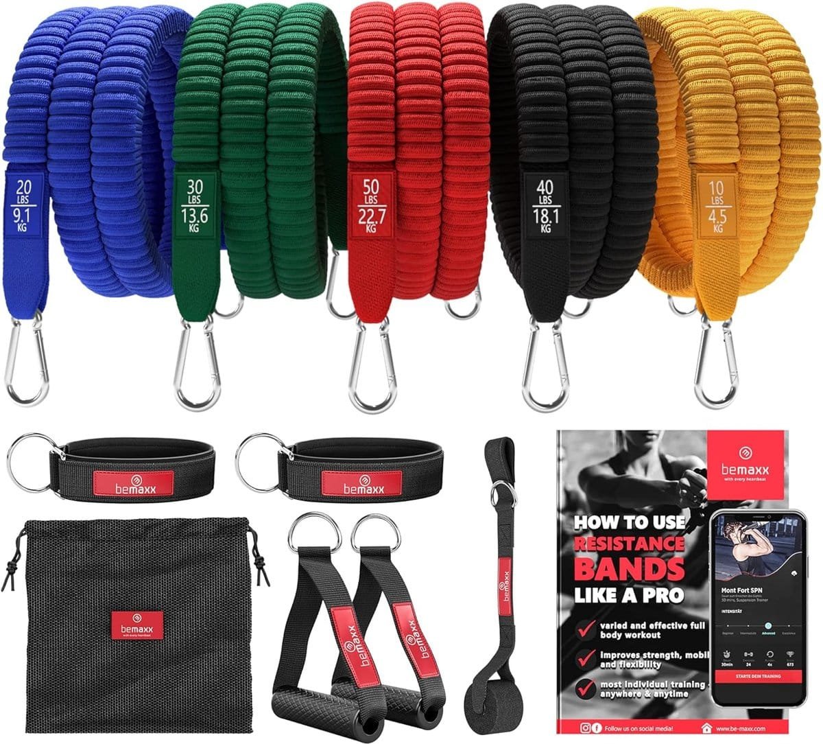 – + – Het BeMaxx trainings eBook met meer dan 70 verschillende oefeningen & tips helpt om ontelbare toepassingsmogelijkheden van de weerstandsbanden optimaal te benutten en het maximale uit de training te halen. Je ontvangt ook een exclusieve vouchercode voor een testmaand met de SUMMFIT-BODYWEIGHT APP per e-mail.