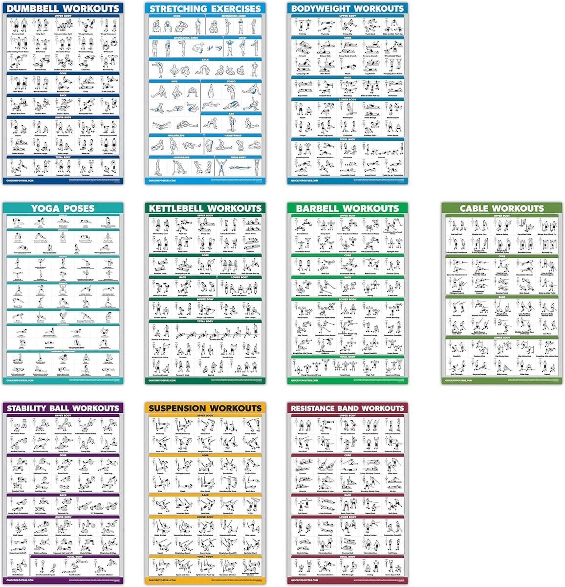 Uitgebreide set van 10 gelamineerde oefenposters (45,7 x 68,6 cm) die essentiële trainingen illustreren. Inclusief oefeningen voor kabelmachine, halter, kettlebell, weerstandsbanden, lichaamsgewicht, ophanging, stretching, en yogahoudingen. Ideaal voor elke thuis- of professionele sportschool als duidelijke trainingshandleiding.