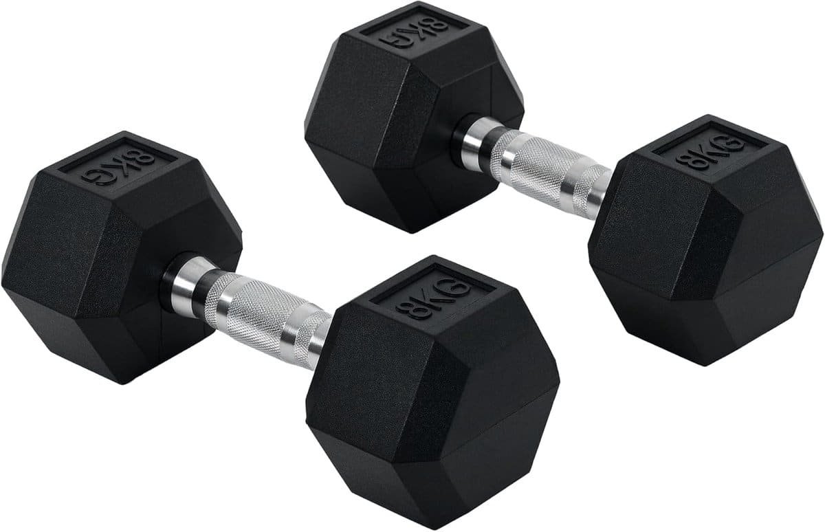Deze set van twee rubberen zeshoekige halters, met een totaal gewicht van 16 kg (2 x 8 kg), is ideaal voor uw fitnessroutine. Geschikt voor krachttraining, spiertraining en gewichtheffen, zowel thuis, in de sportschool als op kantoor. Het zeshoekige ontwerp voorkomt wegrollen en zorgt voor veiligheid tijdens het trainen van bijvoorbeeld schouders, armen en borst. Het rubberen materiaal is bovendien vloervriendelijk en beschadigt uw ondergrond niet. De halters zijn compact, gemakkelijk op te bergen en perfect voor iedereen die zijn conditie wil verbeteren, spieren wil opbouwen of calorieën wil verbranden. Specificaties: Kleur: Zwart. Materiaal: Metaal en rubber. Afmetingen halterkop: 12,7 x 11 x 8,6 cm (L x B x H). Totale halter lengte: 30,5 cm. Handvat lengte: 12,8 cm.
