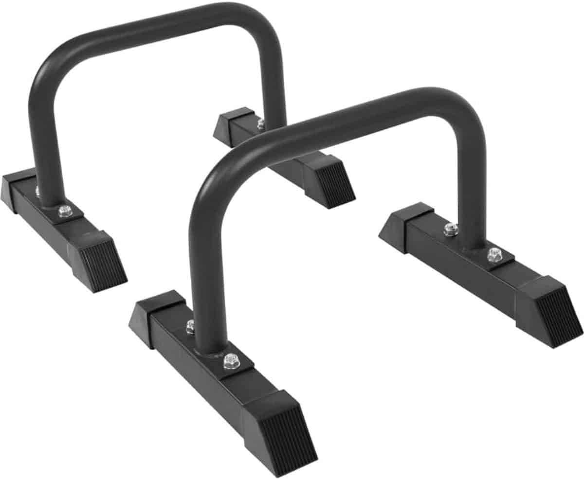 Versterk je hele lichaam effectief thuis of buiten met deze set van 2 stevige push-up bars (parallettes). Ideaal voor gerichte training van borst, triceps en buikspieren door middel van dips, push-ups en beenheffen. De handgrepen zijn gemaakt van massief staal en hebben vloervriendelijke rubberen doppen voor een stabiele en veilige grip zonder je vloer te beschadigen. Geschikt voor beginners tot professionals, deze ruimtebesparende trainingsaccessoires ondersteunen een maximale belasting per standaard van 100 kg. Verkrijgbaar in verschillende maten voor de perfecte trainingshouding. Een essentieel hulpmiddel voor een gevarieerde en effectieve calisthenics workout.