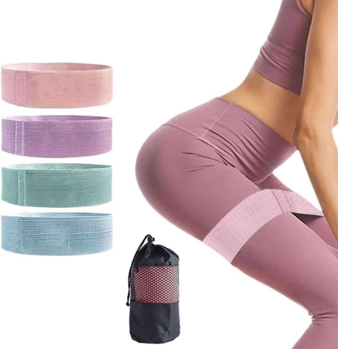 Set van 4 hoogwaardige weerstandsbanden, ideaal voor kracht- en duurtraining voor zowel dames als heren. Gemaakt van duurzaam polyester met versterkte stiksels en ingebouwde siliconen strips voor een antislip en veilige grip tijdens de oefening. De banden zijn compact (66 x 5,7 cm) en worden geleverd met een handige opbergtas, perfect voor de sportschool, thuis, yoga, pilates of reizen. De set bevat vier verschillende weerstandsniveaus, duidelijk kleurgecodeerd, zodat ze geschikt zijn voor beginners tot gevorderden om gericht de benen, taille en heupen te trainen en fitnesdoelen te bereiken.