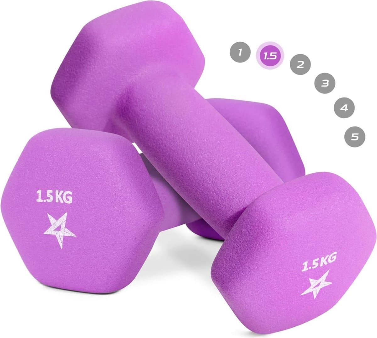 Ontdek deze hoogwaardige halterset van gietijzer, ideaal voor krachttraining, yoga en pilates. Elke halter weegt 1,5 kg en is gemaakt van robuust gietijzer dat niet breekt of buigt na herhaald gebruik. De zachte neopreen coating is r en minder vatbaar voor scheuren dan vinyl, wat zorgt voor langdurig gebruik. De ergonomisch ontworpen handgreep biedt een stevige grip die comfortabel in de hand ligt. Dankzij de dikke, neopreen coating zijn deze halters slipvrij en bieden ze een aangename grip zonder dat handschoenen nodig zijn. De coating vormt ook een beschermende barrière die de halters beschermt tegen beschadiging en de vloer beschermt bij vallen. De halters zijn kleurgecodeerd met een gewichtsaanduiding op de uiteindes, waardoor ze eenvoudig te herkennen zijn. Het hexagonale ontwerp voorkomt dat de halters wegrollen tijdens opslag of training. Deze veelzijdige set is gemakkelijk op te bergen en perfect voor zowel binnen- als buitentrainingen. Ideaal voor krachttraining, arm oefeningen, squats, borstpersen, bicep curls, wandelen, joggen en yoga. Voeg deze veelzijdige halterset toe aan uw fitnessroutine en ervaar het gemak en de effectiviteit van trainen met hoogwaardige materialen.