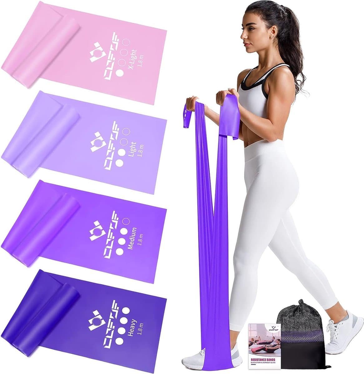 1,8 m fitnessbanden met 4 verschillende weerstandsniveaus paars (0,35 mm/10 lbs. ); geel (0,4 mm/15 lbs. ); Rood (0,5 mm/20 lbs. ); blauw (0,6 mm/25 lbs). Of je nu beginner of ervaren gebruiker bent, je kunt je training heel eenvoudig aanpassen aan je kracht, vaardigheden en comfort. Perfect voor yoga, pilates, fitness, gewichtsverlies, fysiotherapie, krachttraining, revalidatie, bodybuilding en verbetering van flexibiliteit.