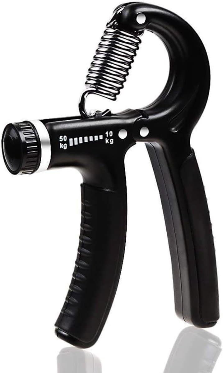 Verstelbare handgrijper gemaakt van roestvrij staal en rubber met een instelbare weerstand tussen 10 tot 50 kg (22-110 lbs). Ideaal om uw onderarmspieren te versterken en de gripkracht van uw vingers te verbeteren. Afmetingen zijn ongeveer 15,5 x 9 x 2 cm. Gewicht: ongeveer 153 gram. Inclusief 1 handversteviger.