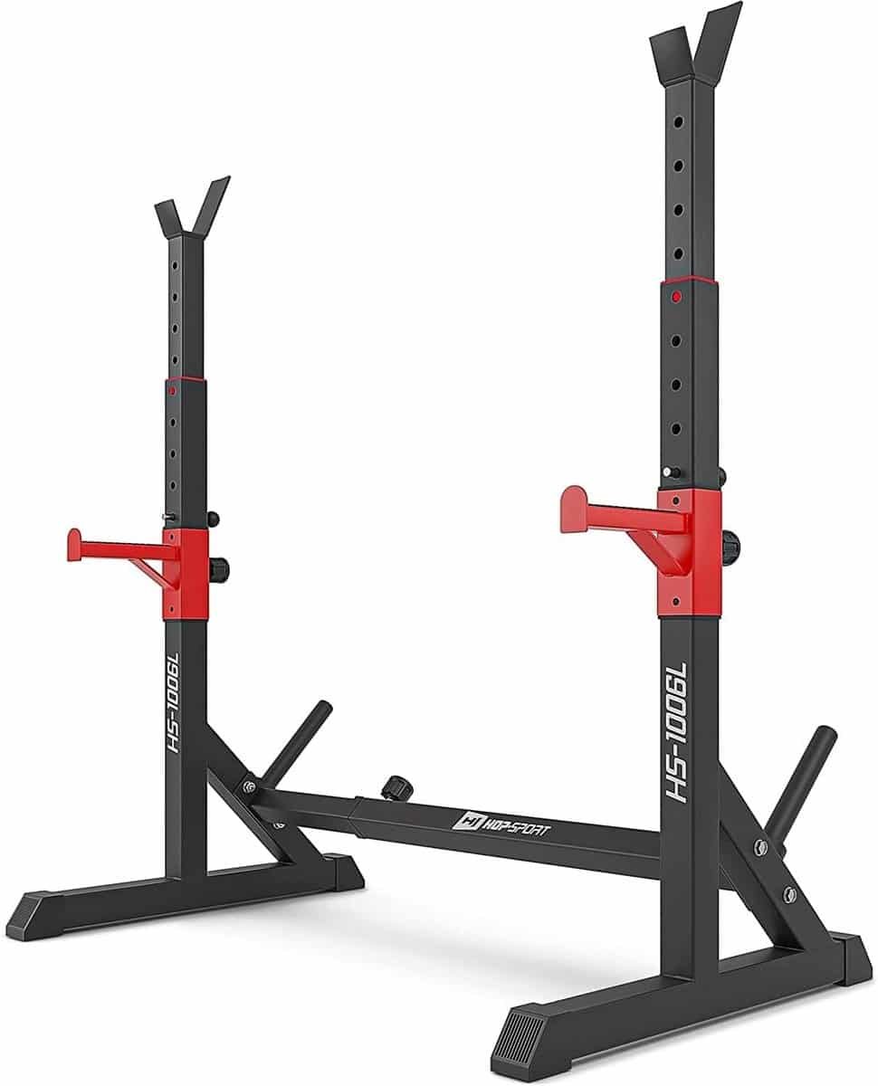Krachtopbouw thuis met een robuust en verstelbaar squat rack. Dit halterstandaard is ideaal voor diverse krachttrainingen zoals bankdrukken en sit-ups. De hoogte van de haltersteunen is verstelbaar in 15 standen (99-164 cm) en de breedte is in 6 standen aan te passen (85,5-111 cm) voor een perfecte afstelling. Uitgerust met in hoogte verstelbare veiligheidssteunen (maximale belasting 200 kg) voor extra veiligheid tijdens intensieve sets. Een zwarte poedercoating beschermt de 50×50 mm stalen constructie tegen corrosie en beschadiging. De standaard is zeer stabiel, kan tot 250 kg dragen en heeft extra pinnen voor het plaatsen van gewichten ter stabilisatie. Eenvoudige montage met meegeleverd montagemateriaal. Geschikt voor zowel serieuze thuissporters als fitnessruimtes.