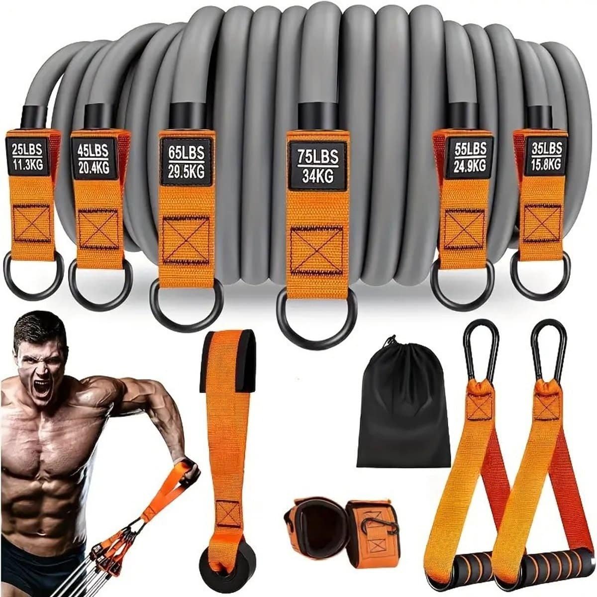 [136 kg spanning] Om te voldoen aan de krachtbehoeften van fitnessliefhebbers, hebben we ’s werelds eerste set weerstandsbanden van 136 kg ontwikkeld. Een echte set weerstandsbanden voor mannen, hij is er! Durf jij ons uit te dagen? De banden kunnen tot 136 kg dragen en hebben zes verschillende weerstandsniveaus (11, 16, 20, 25, 30 en 34 kg). Je kunt onze weerstandsbanden naar wens combineren om aan je krachtbehoeften te voldoen!