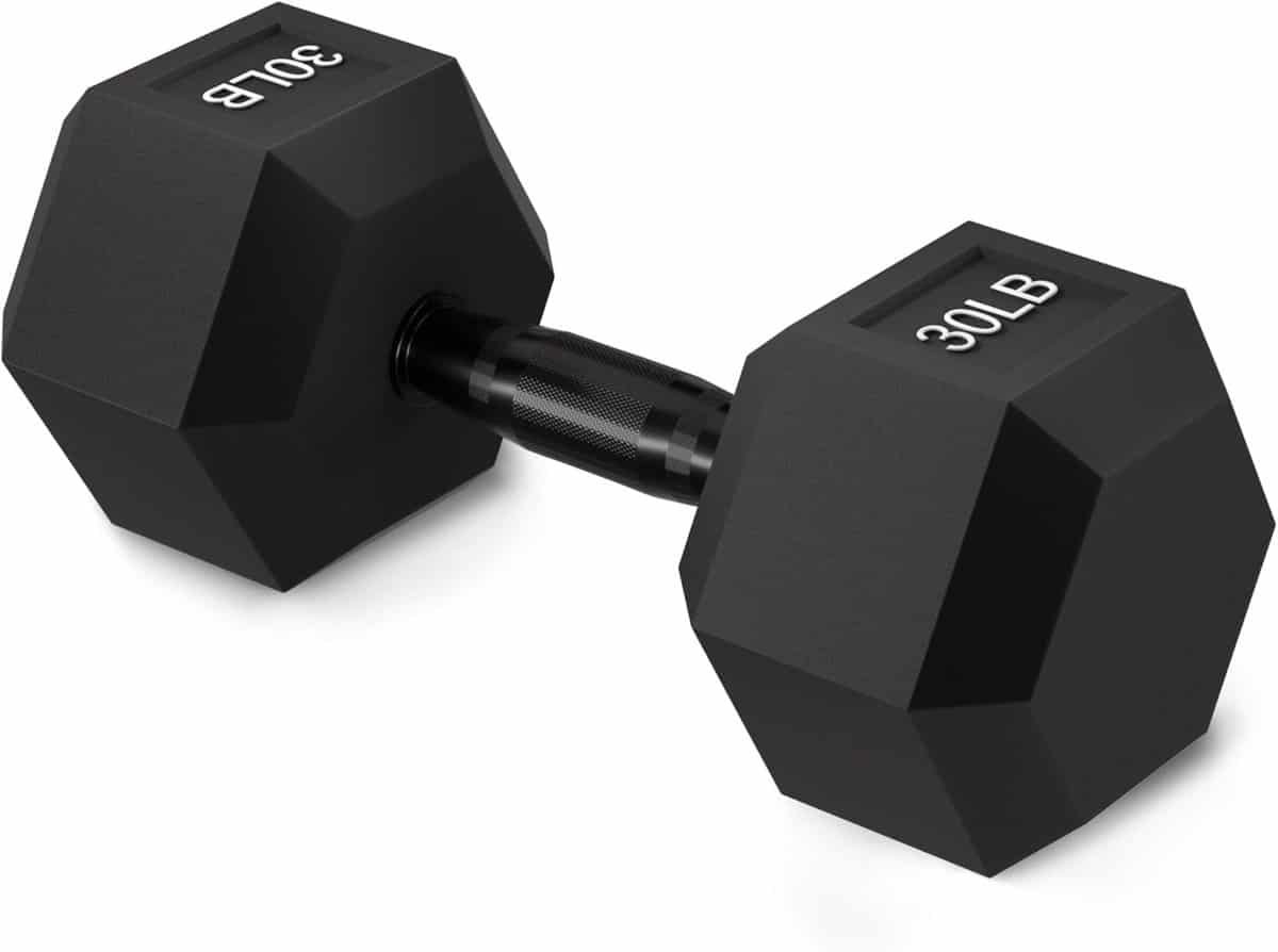 Duurzame, zeshoekige halter met een stevige rubberen coating, ideaal voor verschillende fitnessoefeningen en krachttraining thuis. Voorzien van een ergonomisch, anti-slip metalen handvat voor een veilige grip. Verkrijgbaar in diverse gewichten.