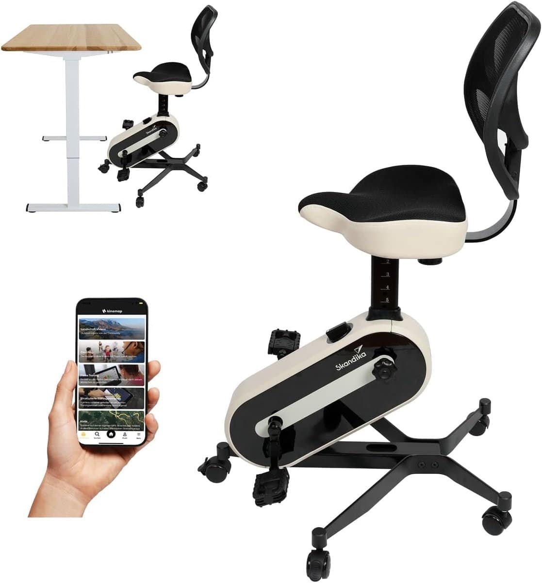 Meer beweging: De desk bike maakt het mogelijk om tijdens het werk fysieke fitness te trainen, comfortabel zittend op kantoor of thuis. Beweging was nog nooit zo eenvoudig. Gezond werken: De 34 × 37 cm grote zitting met 9 cm dikke bekleding en ergonomisch gevormde rugleuning zorgen voor een comfortabele zitpositie, optimaal voor langdurig gebruik aan tafel. Individueel gebruik: De bureaufiets is 8-voudig in de zithoogte verstelbaar, van 59 tot 84 cm, en kan onder een in hoogte verstelbaar bureau of vrij in de kamer worden gebruikt. De pedalen zijn inklapbaar als de fiets alleen wordt gebruikt om op te zitten. Effectieve training: Voorzien van 8 handmatig instelbare weerstandsniveaus, een magneetrem, een 3-delige trapas en bluetooth-interface voor apps zoals Kinomap, waardoor trainingsgegevens eenvoudig te volgen zijn. Compact design: Met 5 transportwielen kan de Office Bike eenvoudig verplaatst worden. Voor een veilige pasvorm kunnen 3 wielen worden vastgezet met één rem. De hometrainer heeft afmetingen van 85,5 × 77,5 × 118,5 cm en weegt 21,8 kg, met een maximale draaglast van 150 kg.