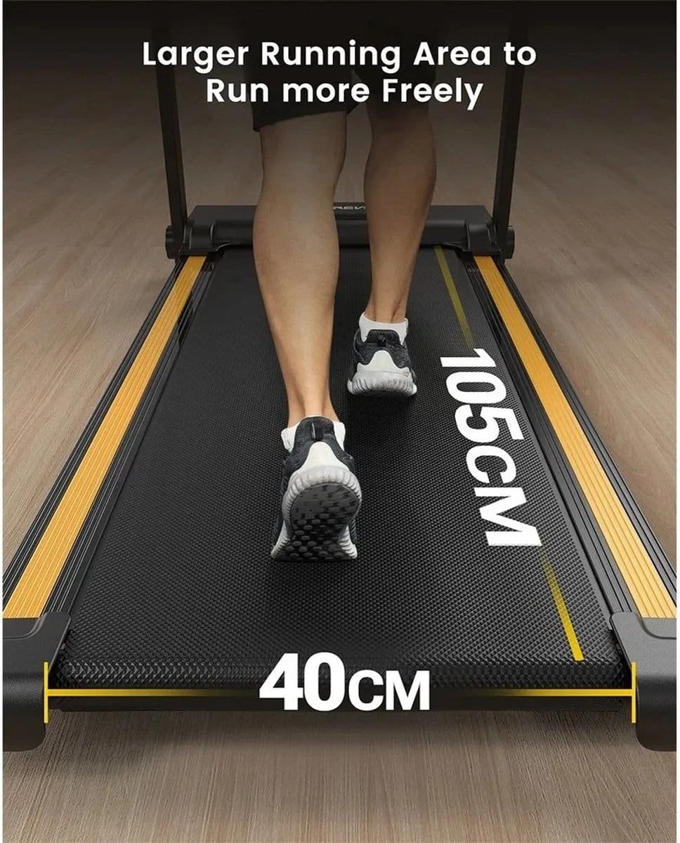 Deze loopband is uitgevoerd in stijlvol zwart en gemaakt van duurzame materialen die bestand zijn tegen dagelijks intensief gebruik. De loopband heeft een loopoppervlak van 120×40 cm, wat voldoende ruimte biedt voor comfortabele beweging, zonder dat het apparaat te veel ruimte inneemt. Met ingebouwde schokdempers wordt elke stap opgevangen om gewrichtsbelasting te minimaliseren, wat bijdraagt aan een veiligere trainingservaring.