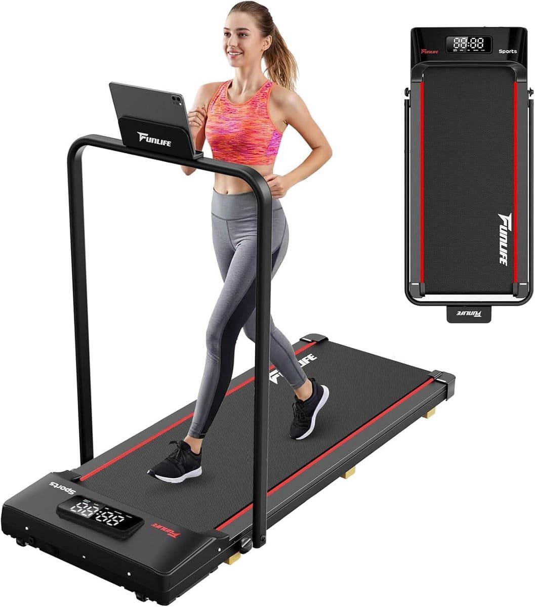 Ontdek de veelzijdige en stille loopband voor thuisgebruik, ideaal voor iedereen, van senioren tot kantoorwerkers. Dit 3-in-1 mini loopapparaat combineert hardlopen (tot 8 km/u), wandelen en lopen onder een bureau. Met een ultraslank ontwerp van slechts 10,5 cm hoog past deze loopband gemakkelijk onder uw bed, bank of bureau. Dankzij de stabiele, inklapbare handgreep biedt deze loopband veilige ondersteuning voor revalidatie, beginners of iedereen die extra stabiliteit wenst. De krachtige 2.0 PK motor is fluisterstil (onder 50 dB), waardoor u traint zonder de buren te storen, perfect voor appartementen of tijdens het werken. Geniet van een gewrichtsvriendelijke training dankzij de vijflaagse loopmat en 6-punts schokdemping. Deze loopband wordt volledig gemonteerd geleverd en is direct klaar voor gebruik. Ondersteunt een maximaal gewicht tot 120 kg. Vind de ideale balans tussen dagelijks leven en beweging, precies zoals u het wilt!