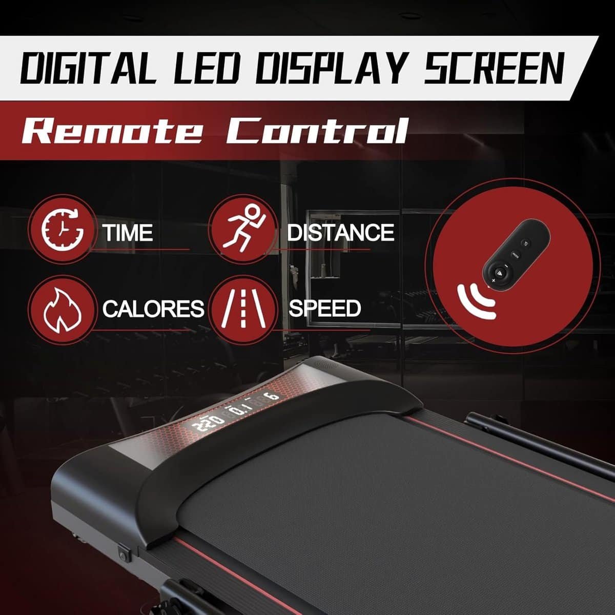 Met de handgreep en magnetische afstandsbediening heb je altijd volledige controle over je training. De bedieningsknoppen aan de bovenkant van de handgreep maken het mogelijk om de snelheid en modus snel aan te passen, terwijl de magnetische afstandsbediening je de vrijheid geeft om de instellingen eenvoudig te beheren zonder je training te onderbreken. De afstandsbediening kan zelfs handig aan de armsteunen worden bevestigd, zodat je deze niet verliest en snel binnen handbereik hebt. Daarnaast wordt de loopband geleverd met een digitaal LED-scherm, waarop je tijd, snelheid, afstand en calorieën kunt volgen, zodat je altijd op de hoogte bent van je voortgang en je doelen kunt bijstellen waar nodig. Wil je je training optimaliseren? Zet je smartphone of tablet in de handige houder en volg je favoriete online trainer of muziek terwijl je traint!