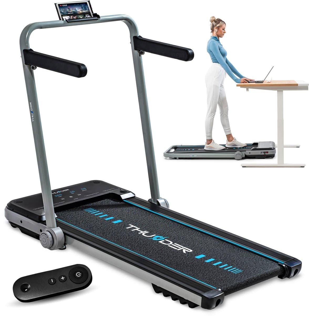 THUNDER® Loopband | IMPACT-SILVER | Opvouwbaar en Krachtig | Sneltoetsen | Veiligheidssleutel | Transportwielen | Plaats voor telefoon/tablet | Compatibel met mobiele apparaten | Bluetooth-app | Afstandsbediening | Luidsprekers | Max. 130 kg |