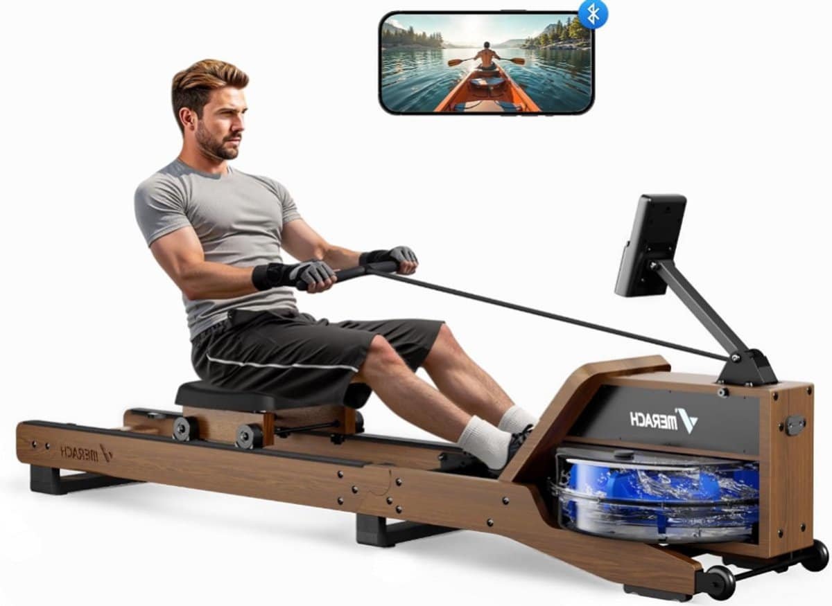 Waterroeimachine – Roeitrainer – Fitnessapparaat – Roeitoestel – Indoor Rower – Opvouwbaar – Rubberhouten Frame – Bluetooth App Met Interactief Kaartspel