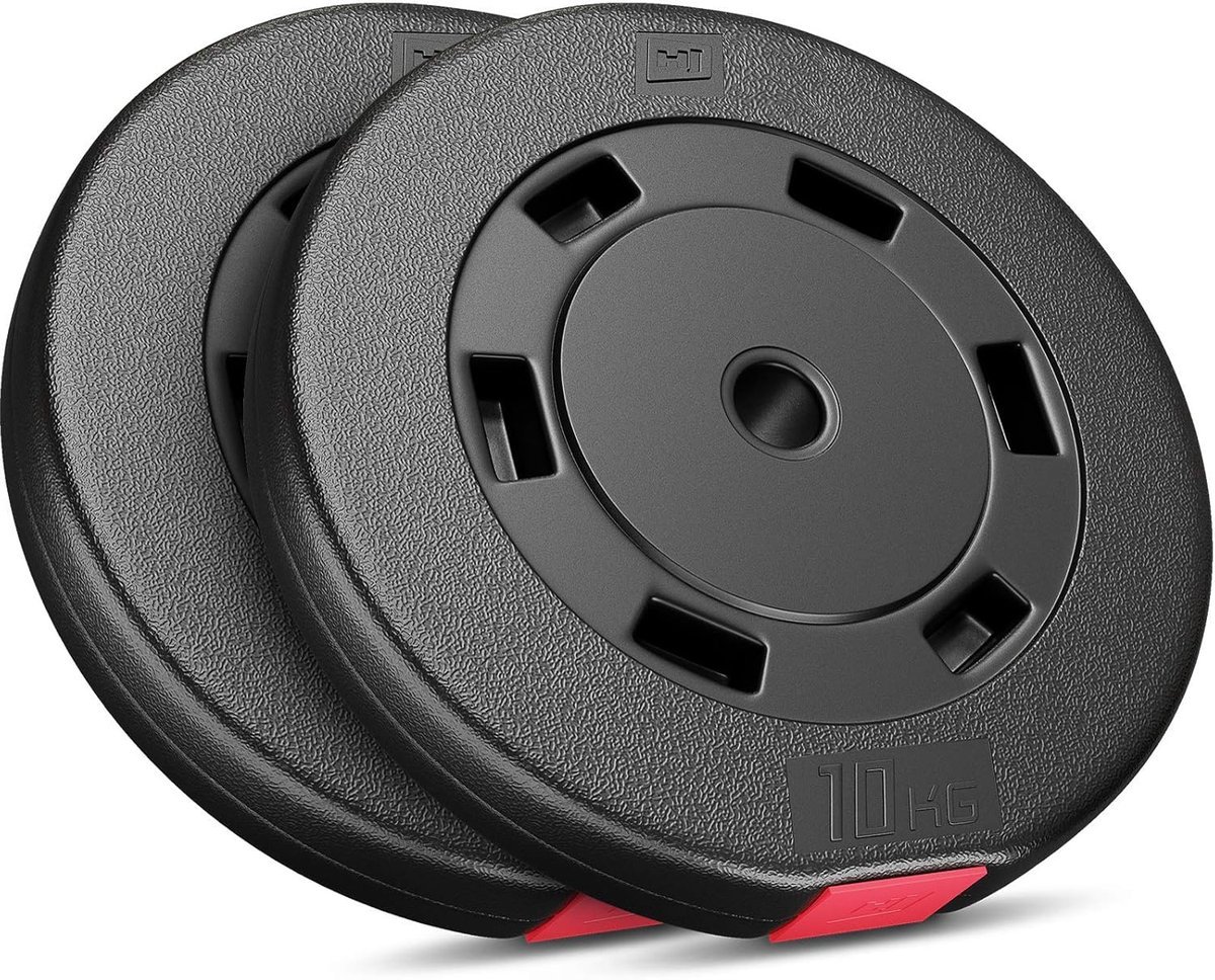 Maak je homegym compleet met deze set kunststof halterschijven van 20 kg en 30 kg. De set bestaat uit 2 schijven van 10 kg met een gatendiameter van 30/31 mm en heeft een diameter van 34 cm en een dikte van 54 mm. Deze duurzame schijven zijn gemaakt van een speciaal mengsel van zand en cement, versterkt met interne dwarsprofielen en bekleed met meerlaagse kunststof voor langdurige bescherming. De afgeschuinde randen voorkomen dat de schijven wegrollen en zorgen voor veiligheid tijdens het trainen. Met universele compatibiliteit voor standaard halterstangen met een buitendiameter van 30 mm, blijven de schijven stevig op hun plaats, zodat je je kunt focussen op je krachttraining. Geschikt voor diverse oefeningen, of je nu met een lange halterstang, korte halter of in je eigen trainingen werkt.