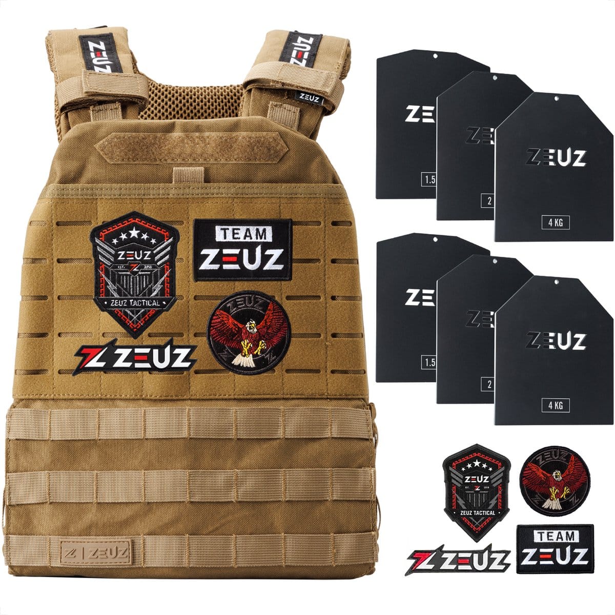 · Inhoud: Gewichtsplaten: 2 Stuks 1.5 KG, 2 Stuks 2 KG, 2 Stuks 4 KG. Gewichtsvest 1.5 KG. Patches: ZEUZ® embleem, Team ZEUZ, ZEUZ adelaar, Tactical)