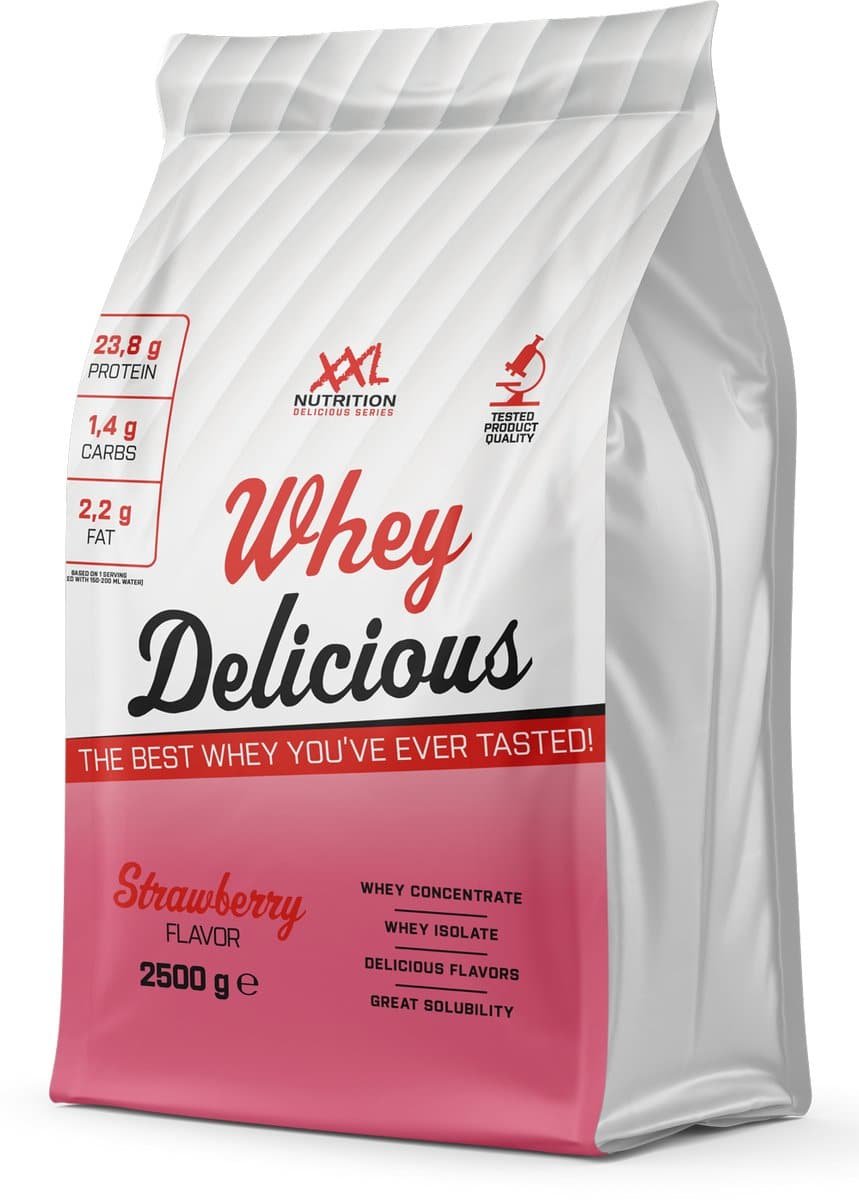 XXL Nutrition – Whey Delicious – 80% Eiwit – Aardbei – Wei Eiwitpoeder met BCAA & Glutamine, Proteine Poeder, Eiwit shake, Whey Protein – Diverse Smaken – 2500 gram (83 shakes)