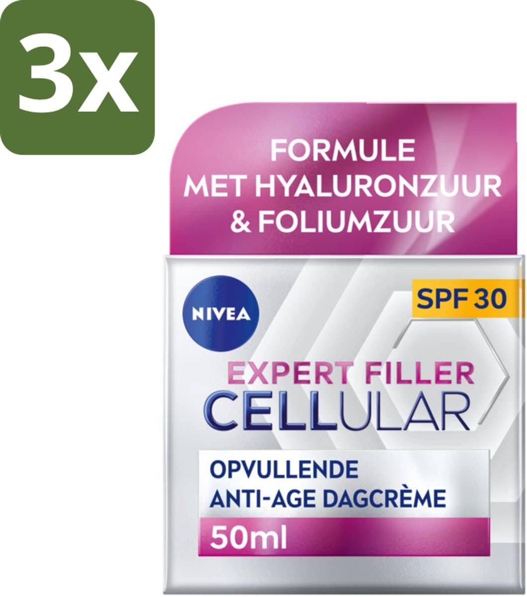 NIVEA – CELLular Expert Filler Dagcrème – Anti-Veroudering Gezichtscrème – SPF 30 – Met Hyaluronzuur, Creatine & Foliumzuur – 50 ml – Bulkverpakking – 3 stuks