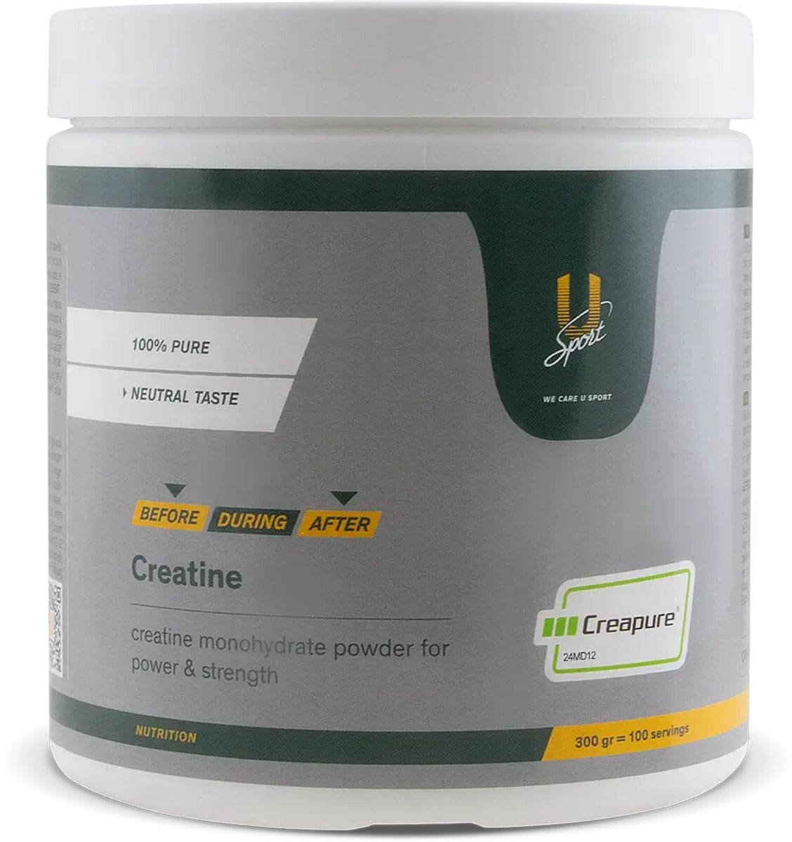 U-Sport Creatine kopen: Kracht voor elke sporter Met de U-Sport Creatine 300 gram kies je voor kwaliteit en rendement. Bij een dagelijkse inname van 3 gram bevat deze pot maar liefst 100 doseringen, wat neerkomt op slechts 26 cent per portie. Het is een van de meest onderzochte en effectieve supplementen voor iedereen die serieus met zijn prestaties bezig is.