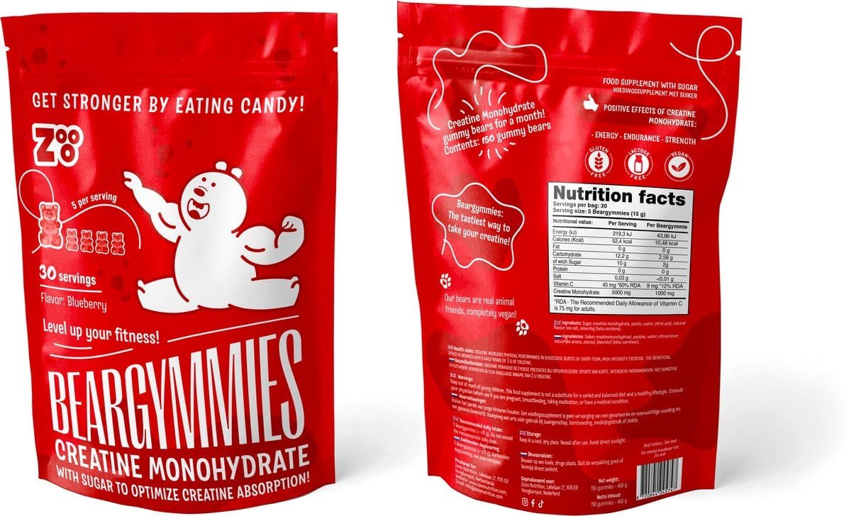 Creatine is effectief voor sportprestaties en komt vaak voor in poedervorm. Echter, de Beargymmies van Zooo bieden een smakelijker alternatief met dezelfde voordelen als creatine monohydraat, ideaal voor spiergroei en/of gewichtsverlies. Zo kun je genieten en werken aan je fitnessdoelen tegelijk. Snoepen & groeien, Dit kan alleen bij: Zooo!