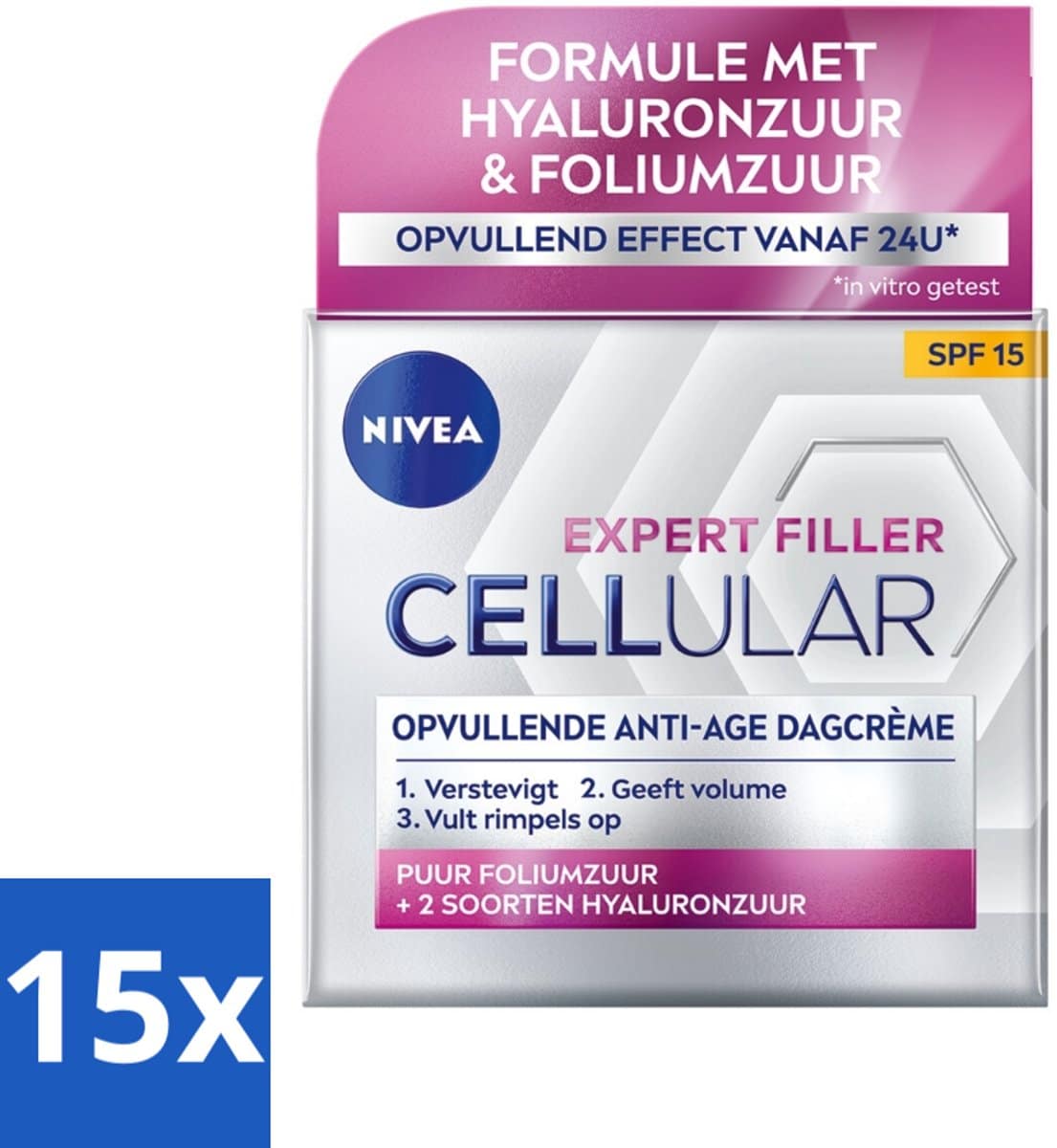 NIVEA – CELLular Expert Filler Dagcrème – Anti-Veroudering Gezichtscrème – SPF 15 – Met Hyaluronzuur, Creatine & Foliumzuur – 50 ml – Bulkverpakking – 15 stuks