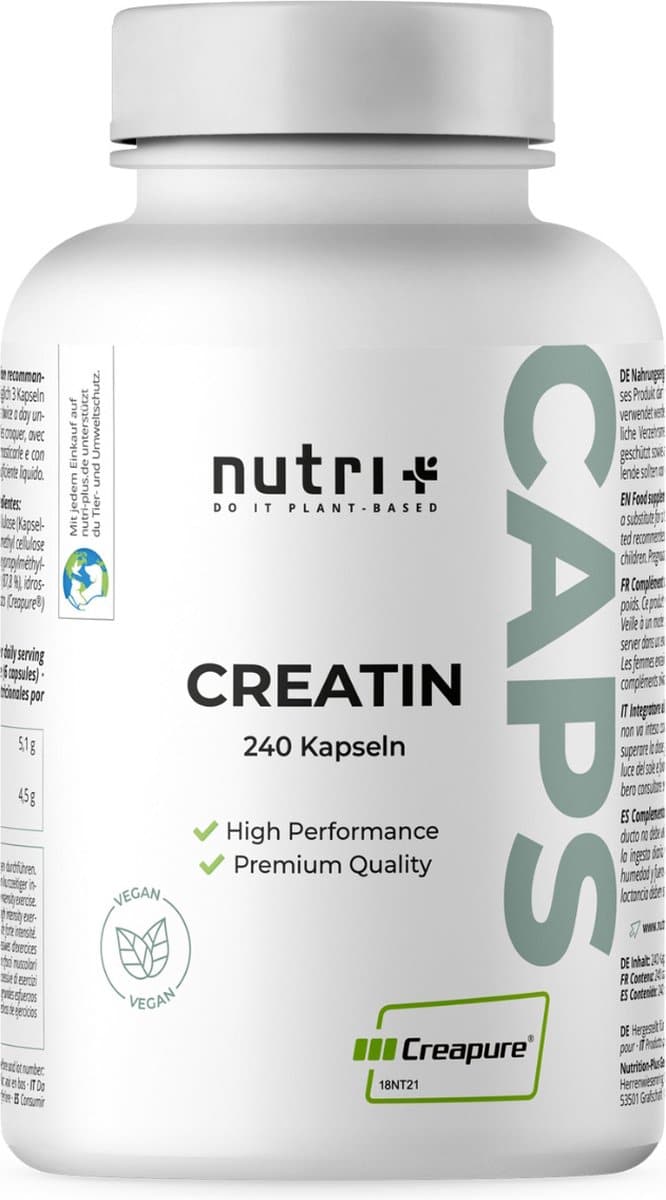 Nutri + Creatine Creapure Capsules – 99,99% puur – hoogste dosering – 240 veganistische capsules – 4,5 g pure creatine monohydraat per Dagelijkse portie – Made in Germany