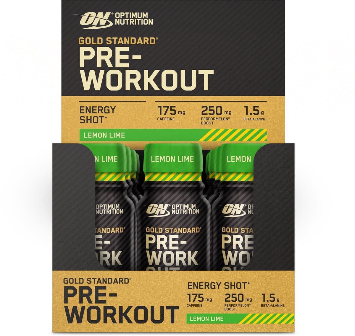 Hoogwaardige preworkout shot van Optimum Nutrition voor betere focus en performance Geef jezelf de kans om voor goud te gaan met de eerste Gold Standard Pre-workout Shot van Optimum Nutrition, het beste sportvoedingsmerk ter wereld. Gold Standard Pre-workout Shot verbetert je focus met 175 mg cafeïne per portie, en 1,5 gram bèta-alanine en vitamine B6 en B12 ter ondersteuning van het energiemetabolisme. Bovendien bevat het ook het nieuwe ingrediënt PerformMelon Boost dat je helpt het meeste uit je training te halen. Gold Standard Pre-workout Shot is verkrijgbaar in twee heerlijke smaken: Lemon & Lime, en Mixed Berry. Dankzij het handige formaat is het de ultieme pre-workout shot.