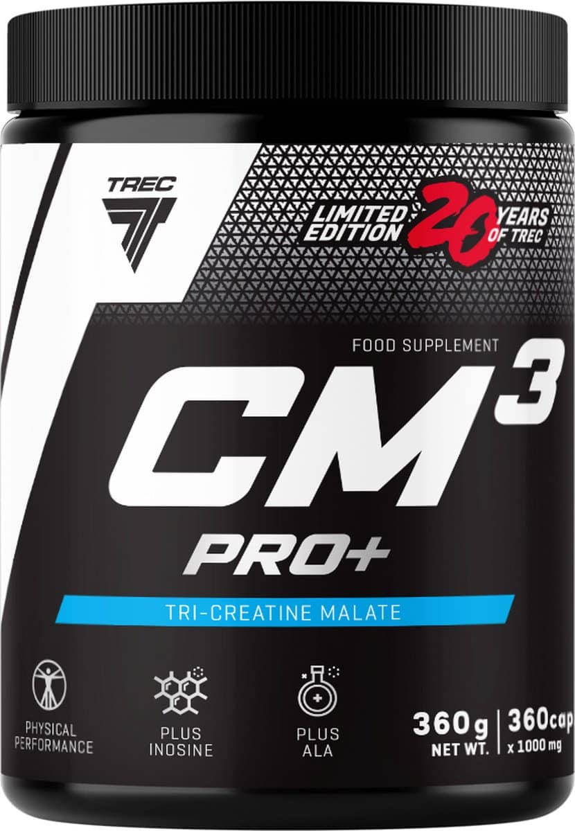 CM3 PRO+ is een voedingssupplement dat tricreatinemalaat bevat met inosine en alfa-liponzuur (ALA).